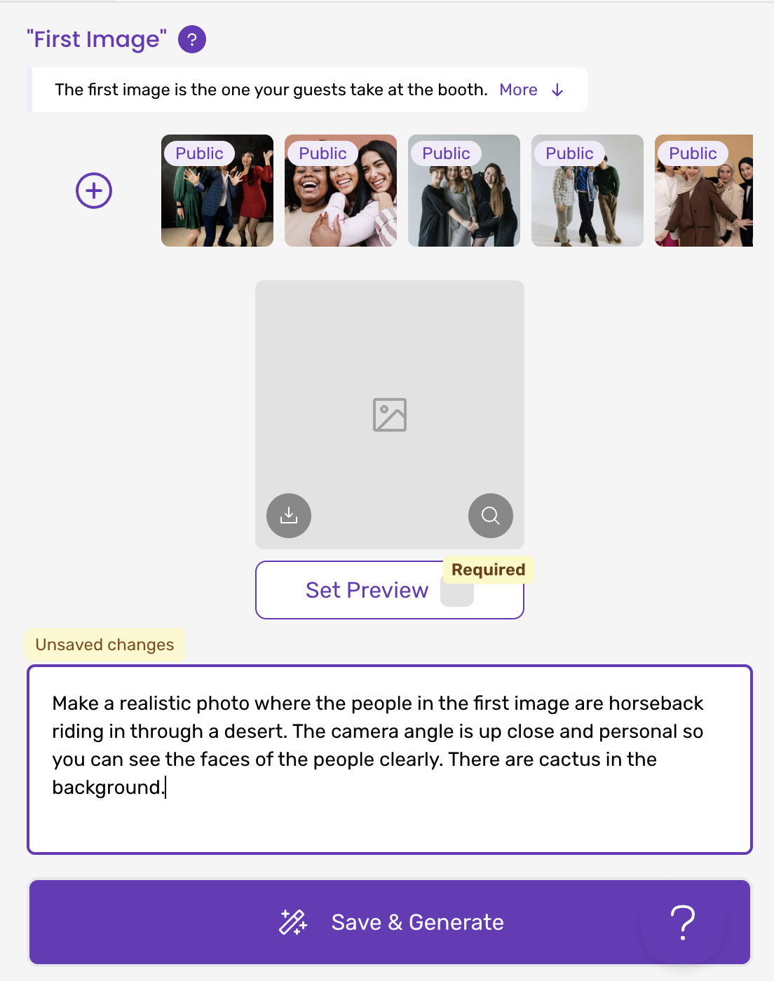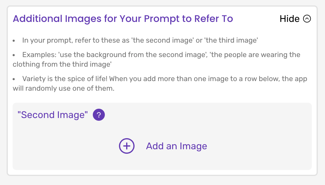 When you refer to the "first image" in your prompt, that's the photo that has your guest(s). You can also upload additional images that you refer to in your prompt, in this section: