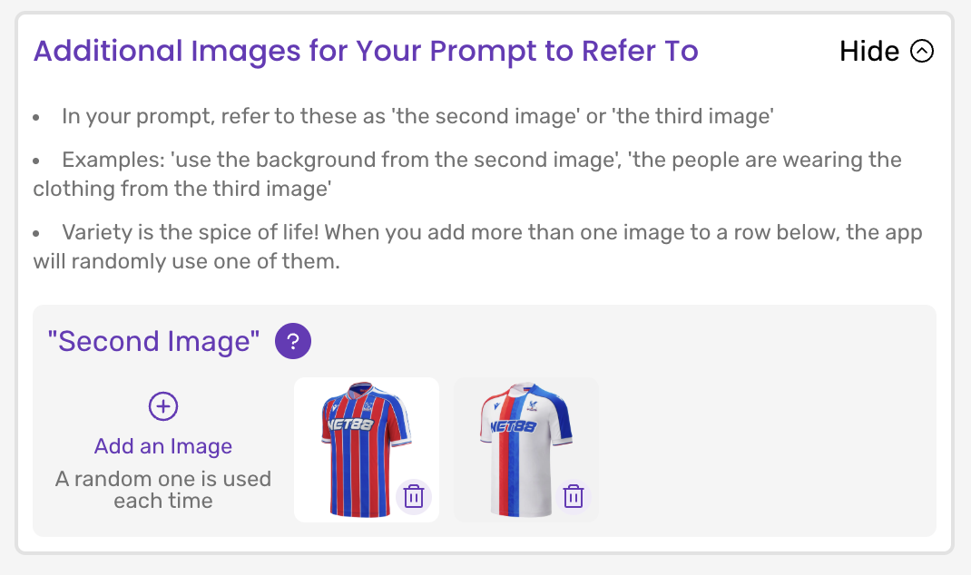 You can add more than one image per "row". When you do this, the app will choose one of the images in the row at random. For example in the following screenshot, the prompt would refer to the "second image" and the app would either use the Crystal Palace primary kit (red/blue jersey) or away kit (white jersey); this would be chosen randomly each time an image is generated.