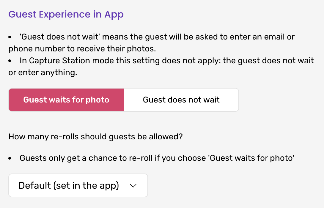 - If you choose "Guest does not wait", the guest is forced to enter an email address or phone number to continue, and they don't wait for the photo to show up in the app - they'll get emailed/texted shortly after when the photo is ready.