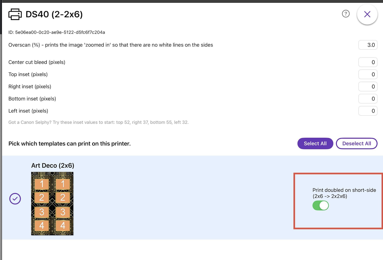 Toggle the switch for Print doubled on short side to Enabled. This tells the software to place two strips on one 4x6 sheet and cut it.