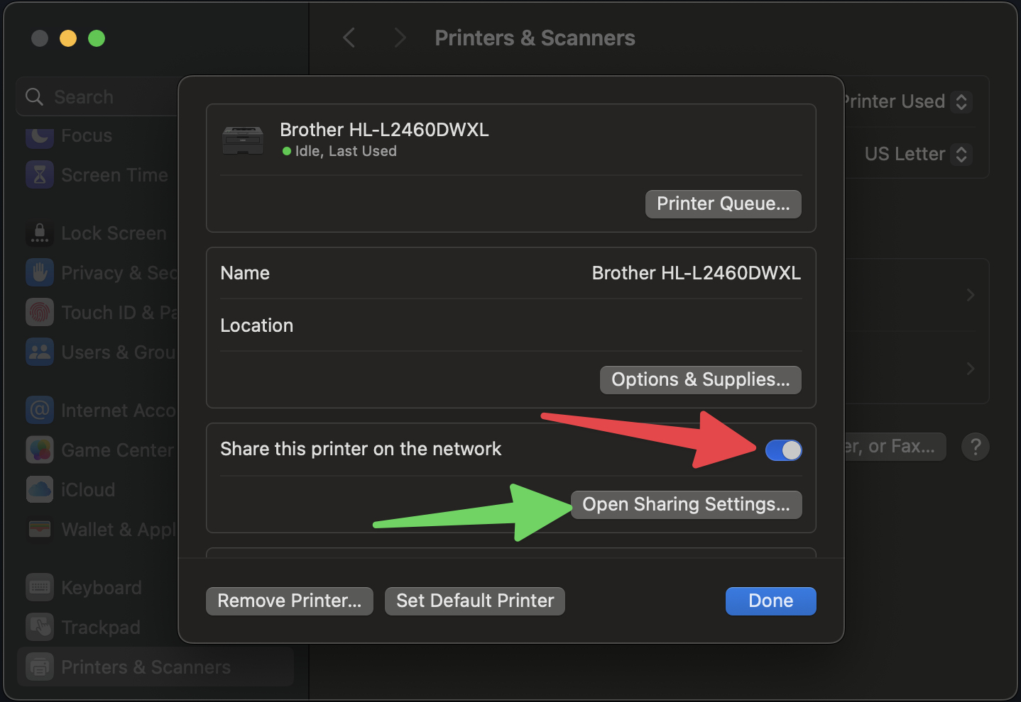 (1) Open the macOS Settings app, go to Printers & Scanners, select your printer, and turn on the Sharing switch as shown by the red arrow in the following screenshot:
