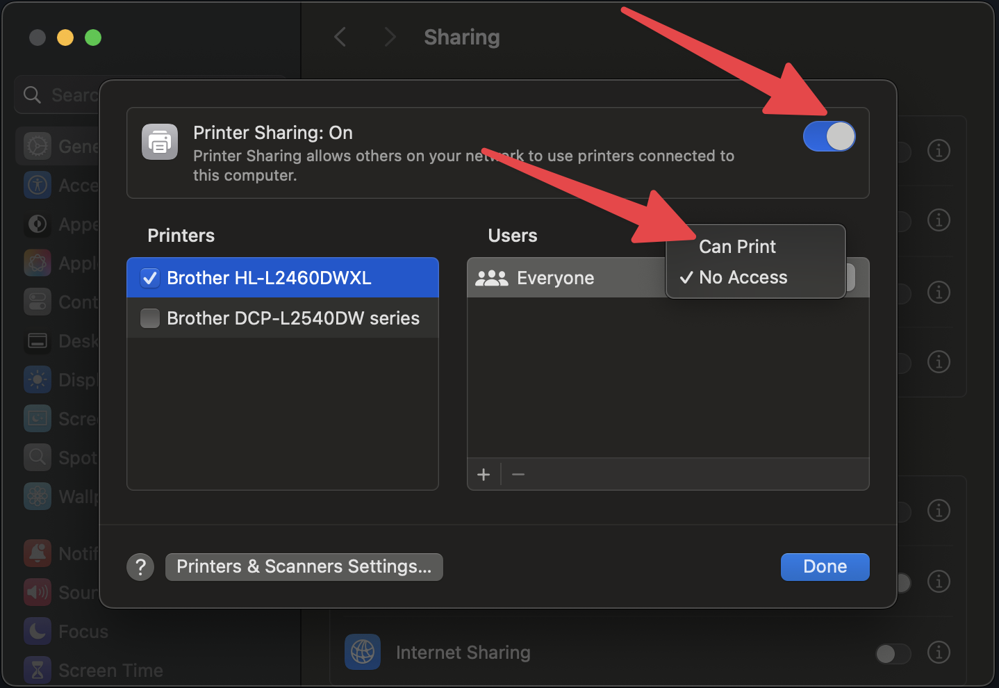 (3) Flip the Printer Sharing switch on (first red arrow). Then select your printer on the left, and change the "Everyone" from "No Access" to "Can Print" (second red arrow)